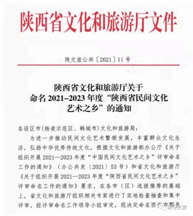 11月5日,被陕西省文化和旅游厅命名为2021—2023年度“陕西省民间文化艺术之乡”。