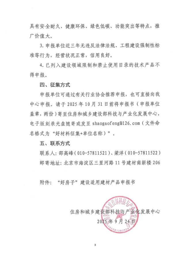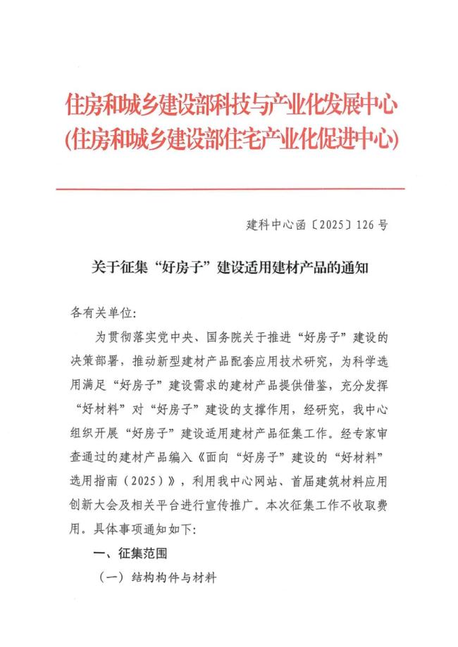 9月25日,住房城乡建设部科技与产业化中心发布关于征集“好房子”建设适用建材产品的通知。全文如下: