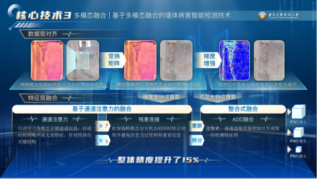 在模型优化阶段,团队进一步引入通道注意力机制,有效捕捉图像中的时空关联特征,推动红外与可见光图像的双模态特征协同,使各类病害的整体识别精度提升20%,其中不规则裂缝与渗漏识别的准确率均提高至93%。