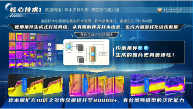 研发初期,数据样本不足成为首道难关。“数据问题让研发进度停滞了半个多月。比赛时间紧张,那段时间大家都倍感压力。”团队负责人孔祥萌回忆道。在集体研讨和教师指导下,团队引入生成式对抗网络数据增强技术,在真实样本约束下,将数据集从两万张有效扩充至十万张,不仅缓解了样本稀缺对模型性能的制约,也为后续研究奠定了坚实基础。