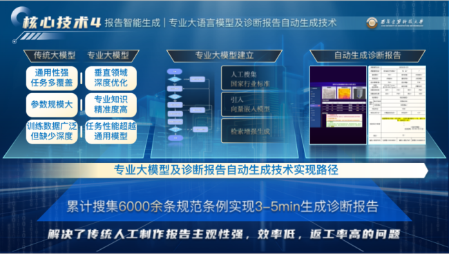 针对传统检测报告依赖人工、主观性强、效率低下的问题,团队构建了涵盖6000余条国家、行业及地方标准的结构化知识库,结合增强检索与大模型技术,实现了专业诊断报告的自动生成。原本需要数小时完成的报告,如今仅需3—5分钟即可输出,在显著提升效率的同时,也保障了评估结果的标准化与客观性。