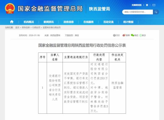 因贷款不审慎等问题,交通银行陕西分行被罚253万元