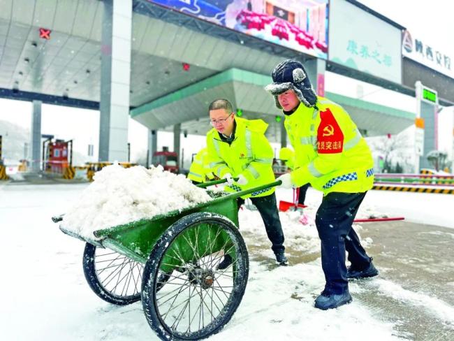 1月19日,西商高速商洛收费站副站长赵红波、票证管理员李鑫合力转运站区积雪。