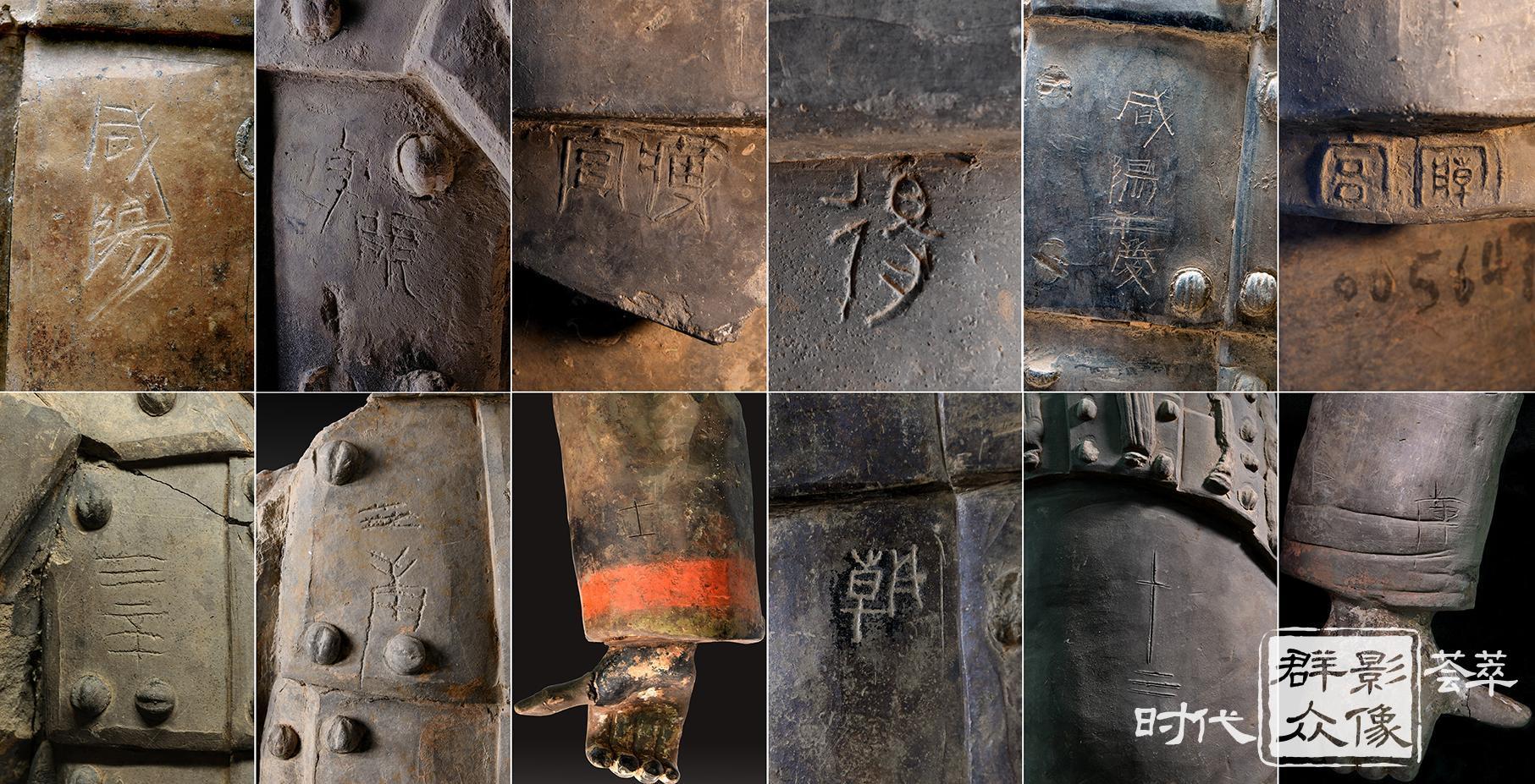 考古发掘和修复的过程中,在陶俑、陶马身上发现一些戳印或刻划的文字。大体可分为两类:一是数字类,为制作陶俑、陶马过程中的编号;二是制作陶俑、陶马的工匠名。