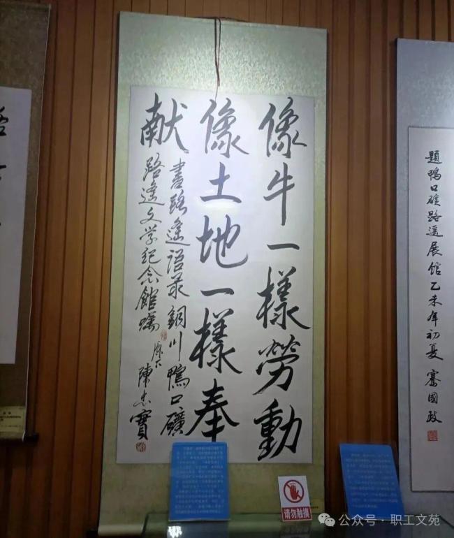 走进展馆的大门,一头拓荒牛的雕塑威武挺立,牛的身后是两行遒劲的大字:像牛一样耕耘,象土地一样产出,这是路遥的名言,也是展馆的灵魂。接下来的内容按照路遥的人生轨迹次第展开,但却着重突出了路遥在铜川特别是在鸭口体验生活的内容,以及书中人物和环境与鸭口矿的密切关系。一幅幅珍贵的历史照片和文物书籍,一幕幕声情并茂的电视镜头,深情讲述着路遥在鸭口煤矿深入井下体验生活的情景,在铜川陈家山煤矿医院埋头写作的情景。路遥的人生历程在这里倏然复活,使人们沉浸在神圣的文学氛围里,也启迪于人生的感悟中。在鸭口矿部分,几代矿工“献了青春献终身,献了终身献子孙”的报国情怀,艰苦奋斗的建设发展历史和辉煌业绩,又使参观者特别是年轻人受到了极具家国情怀和英雄色彩的传统教育。在强烈的震撼和感动中,人们的心灵得以净化,精神得以升华,斗志得以激励。王芳闻秘书长感慨万端说:在已经建成的几个路遥纪念馆里,这个馆是最有特色的。因为它就建在作家生前的生活体验地,而且又是代表作《平凡的世界》。它同时又是路遥拼搏精神与矿工特别能战斗精神的完美结合,其价值其意义不言而喻。