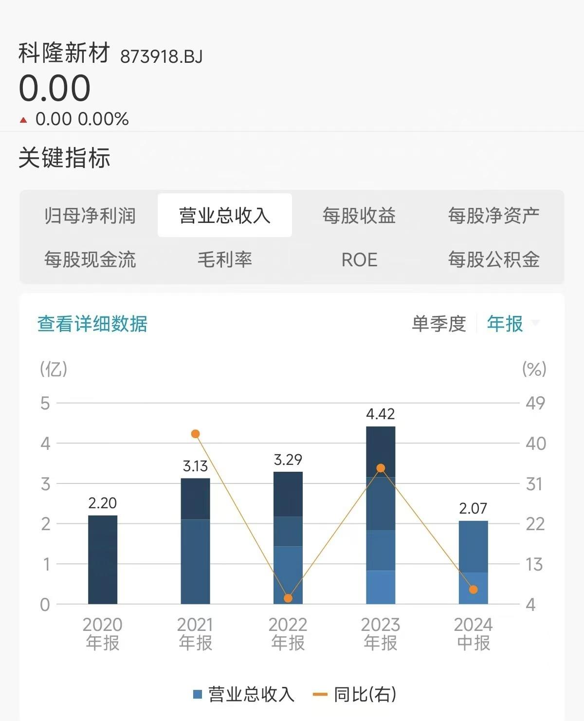 招股书显示,报告期内(2021年度、2022年度、2023年度和2024年1-6月),科隆新材分别实现营收3.13亿元、3.29亿元、4.42亿元及2.07亿元;净利润分别为6612.16万元、5197.05万元、8336.81万元及2991.17万元。
