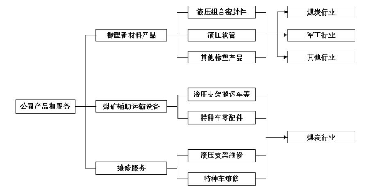 从其产品结构和类型来看,其主要产品和服务包括橡塑新材料产品、煤矿辅助运输设备和维修服务。其中: