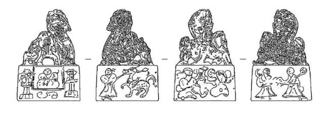 辟邪纽印章大体可分为两类,一类是单体印,另一类是套印。前者流行于西汉末至新莽时期,器形相对较小;后者至东汉时出现,体积因套印所需而有所增大。而且两类印章外表形式也各不相同,单体印纽式精巧,印文多为阴刻,专称多用“私印”。套印母印印台略增高,完整套印由母印、子印或母印、子印、孙印组合而成,多为一大一小两辟邪,印文改为以阳文铸造为主,专称多用“之印”“印信”。此次出土的“王俊之印”套印,纽式为一大一小两只辟邪,较为特殊的是其印台四面分别阴刻有四幅图像。第一面图案阴刻有双阙,其余三面表现的内容几乎都与仙人有关。综合来看,此双阙应当与天门关系密切,由于画面刻画简单,缺乏日、月、凤鸟、蟾蜍、龙、虎、连胜等元素,单从第一面图像来看,很难确认双阙间人物形象的身份,但其余几面有仙人引鹿(路)、羽人拜谒、羽人晤对的内容,应是表达墓主期盼死后升仙的场景。专家推测“王俊之印”套印印台四面的图案,展现的正是墓主对于死后登天门、拜见西王母,继而羽化成仙,于仙界畅游的美好愿景。