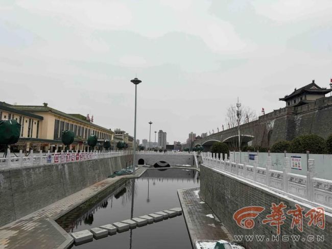 1月20日下午,华商报大风新闻记者在西安火车站南广场看到,原本广场上两处下沉广场已然变了模样,原本埋藏地下的暗涵被打通,西安城墙尚德门至尚勤门城墙下,护城河河水在此静静流淌。如今,西安人的城墙下,不仅有“西安人的火车”,还有一段真正意义上完整的护城河。