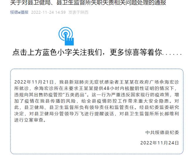 2022年11月21日,绥德县新冠肺炎无症状感染者王某某在政府广场余海宏诊所就诊,余海宏诊所在未要求王某某提供48小时内核酸阴性证明的情况下,违规向其出售防疫管控“五类药品”。这一行为严重违反国家现行防疫政策,增加了疫情在绥德县传播的风险,给全县疫情防控工作带来重大安全隐患。对此,绥德县卫健局、县卫生监督所负有领导责任和监管责任。经绥德县纪委监委研究决定,对绥德县卫健局分管领导万飞进行提醒谈话,对绥德县卫生监督所所长郝维利进行立案审查。