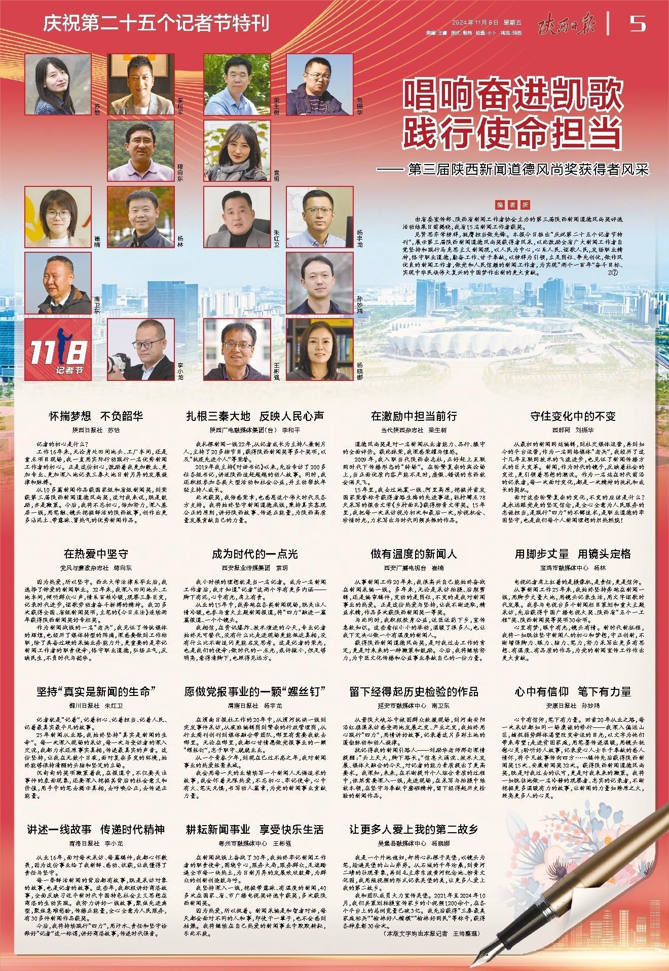 见贤思齐学榜样,挺膺担当做先锋。陕西日报今日推出“庆祝第二十五个记者节特刊”,展示第三届陕西新闻道德风尚奖获得者风采,以此激励全省广大新闻工作者自觉坚持和践行马克思主义新闻观,以人民为中心,心系人民、讴歌人民,发扬职业精神,恪守职业道德,勤奋工作、甘于奉献,以榜样为引领,立足岗位、争先创优,做作风优良的新闻工作者,做党和人民信赖的新闻工作者,为实现“两个一百年”奋斗目标、实现中华民族伟大复兴的中国梦作出新的更大贡献。