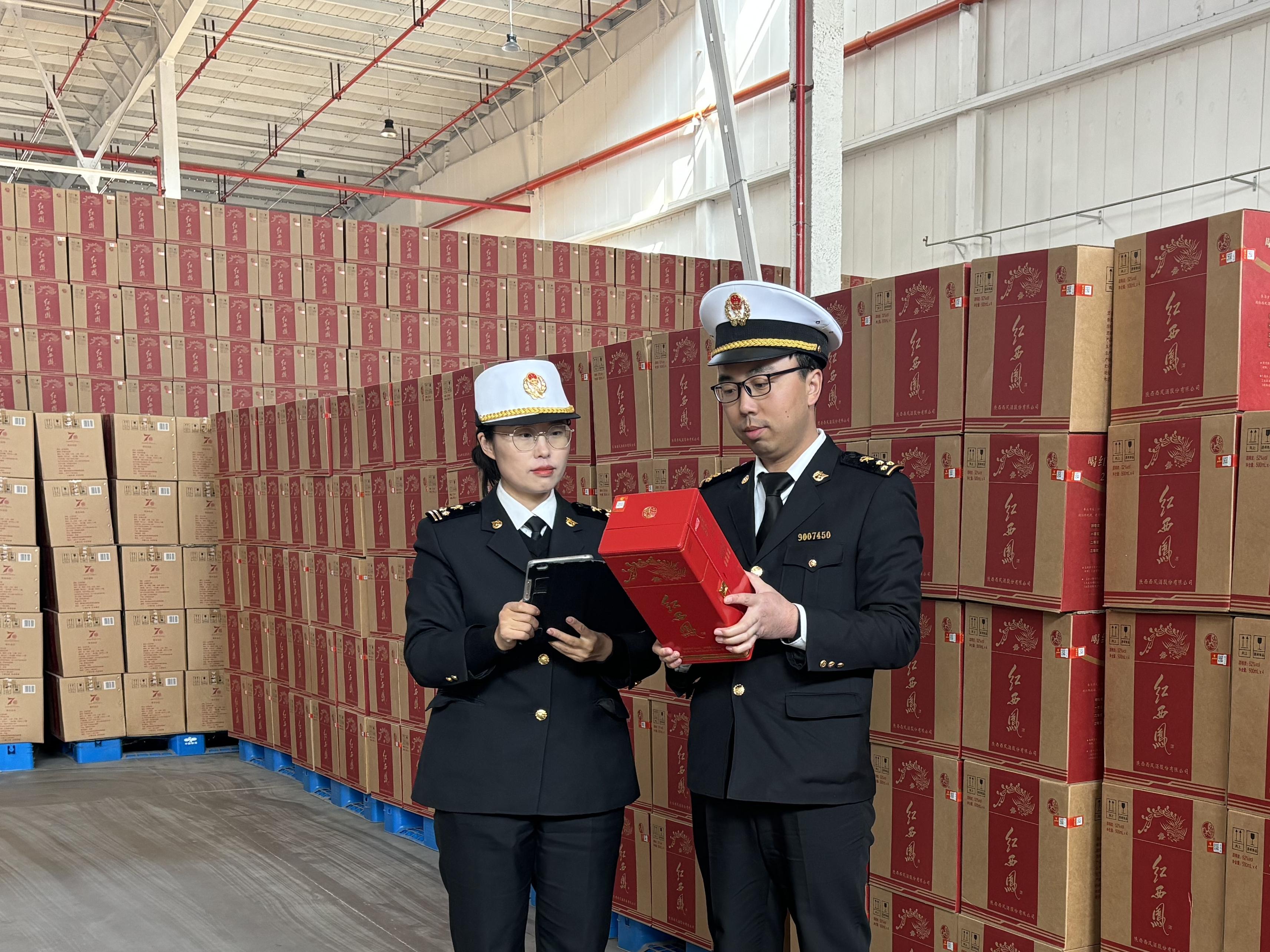 宝鸡海关查检科科长刘刚介绍:“我们开通属地查检‘绿色通道’,快速为企业办理申报、属地查检、云签发出证等通关业务。宝鸡海关2024年共监管出口西凤酒22批次,1.6万余箱。”