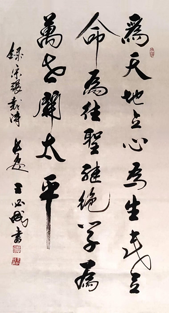 酷爱书法艺术,善于从收藏的历代状元、榜眼、探花、进士、举人秀才的手稿真迹和名人名帖中汲取营养,不断研习中国书法艺术理论,继承历代状元手迹原本,做开路先锋。特别是20多年来,积极探索陨石书画理论和实践,在传统书画的基础上,大胆创新,耕笔不辍,用多种陨石和陨石笔墨以及陨石原墨,坚持书写陨石书法和绘画作品,科学使用陨石原料磁场和能量,并用陨石书画将观众带入宇宙星宿能量场,感受宇宙多维度能量在一定空间的四方八位影响人体生命能量,促其聚维开悟。本人开创的陨石书法,将陨石材料和书法艺术有机结合,形成了独特的艺术风格,不仅丰富了中国书法艺术的表现形式,也赋予了陨石这一特殊材料新的文化和艺术价值。